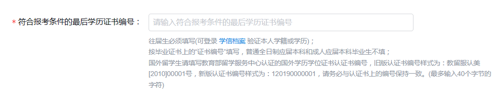 8.畢業(yè)證書編號請?zhí)顚?6位或18位電子注冊號或者學校編號,若畢業(yè)證書上沒有16或18位數(shù)字編號,則填寫證書上其他數(shù)字編號;若有學位證書,請將學位證書編號也填寫準確。畢業(yè)證書編號若只顯示一個編號,則填寫該編號;若顯示兩個編號,則填寫“學校編號”項。