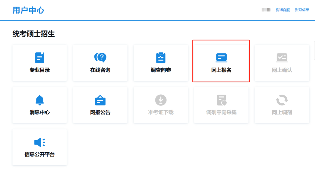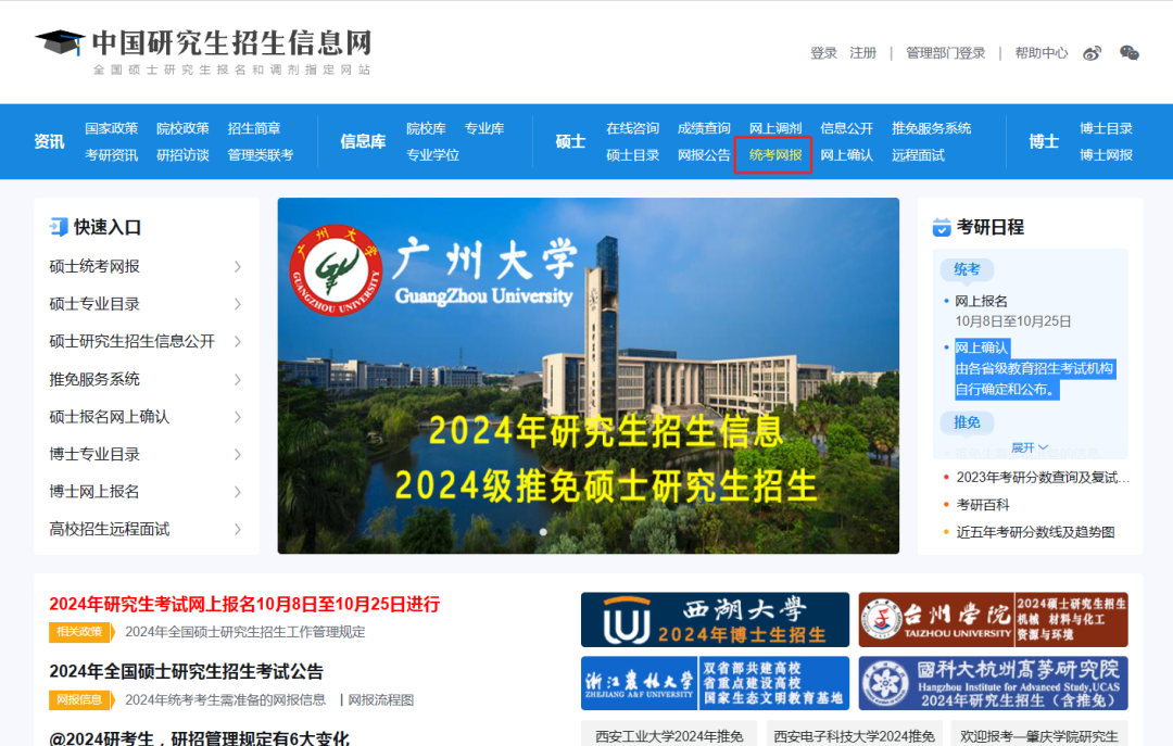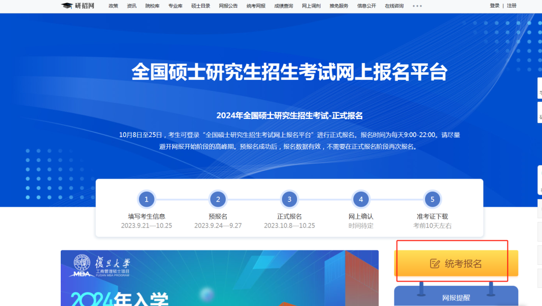 1.登錄“中國研究生招生信息網(wǎng)”(https://yz.chsi.com.cn/),點擊“統(tǒng)考網(wǎng)報”-“統(tǒng)考報名”。