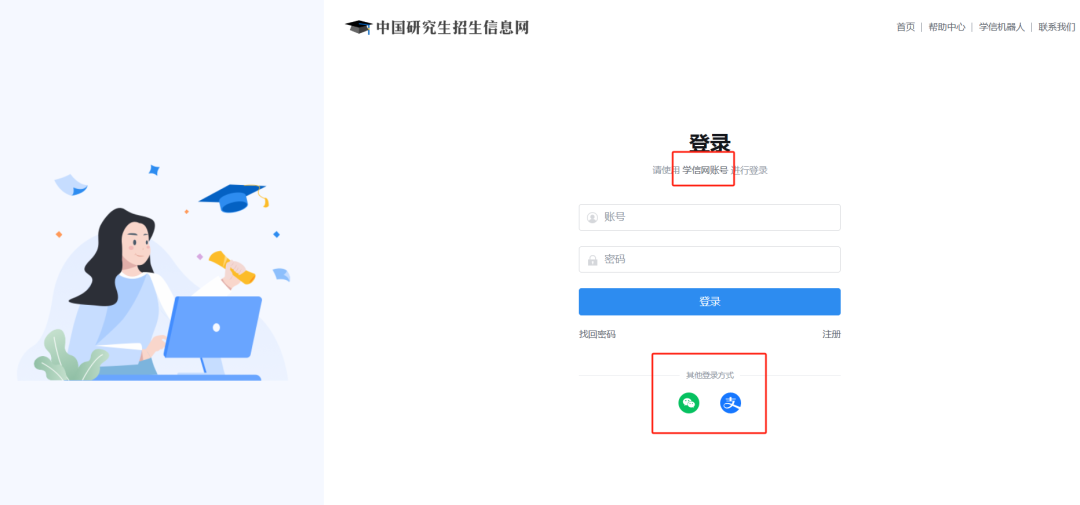 2.使用“學信網(wǎng)賬號”或微信等途徑登陸。