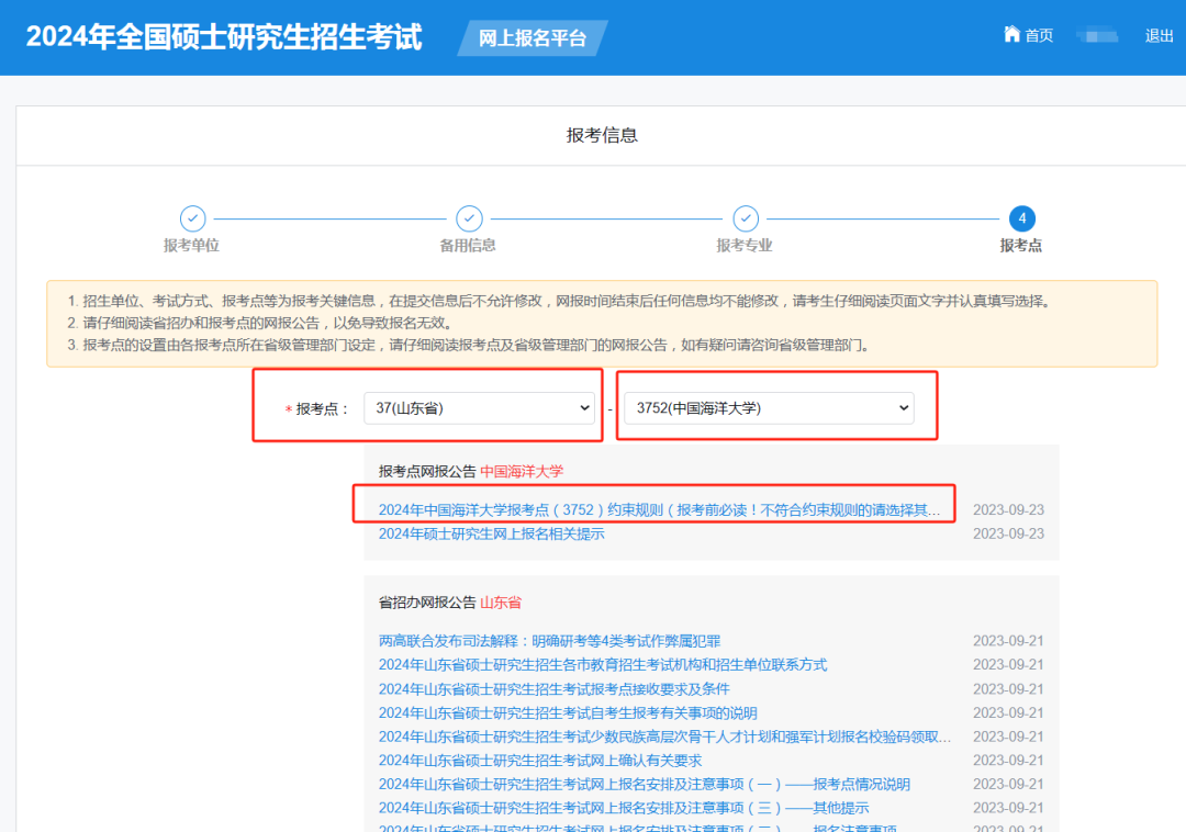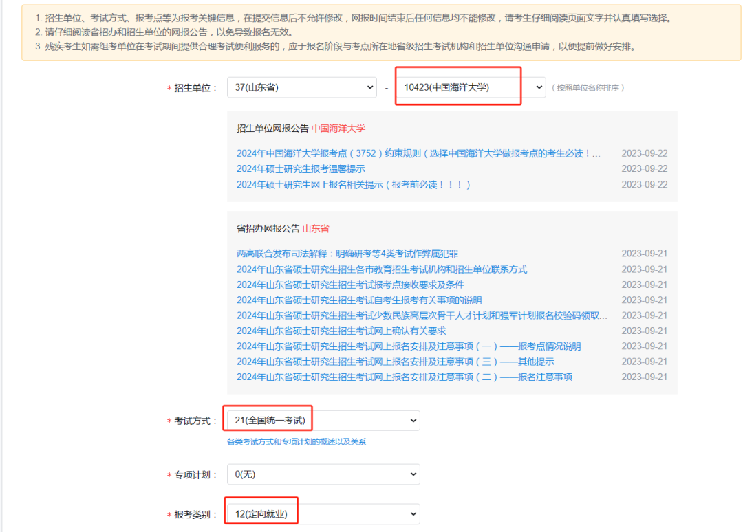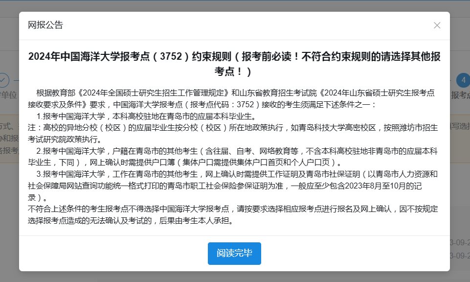 請考生仔細閱讀《約束規(guī)則》,2024年中國海洋大學報考點需滿足:本科高校駐地青島市的應屆畢業(yè)本科生;戶籍在青島市的其他考生(網(wǎng)上確認需提供戶口簿);工作在青島市的其他考生(網(wǎng)上確認需提供工作證明及青島市社保證明)。