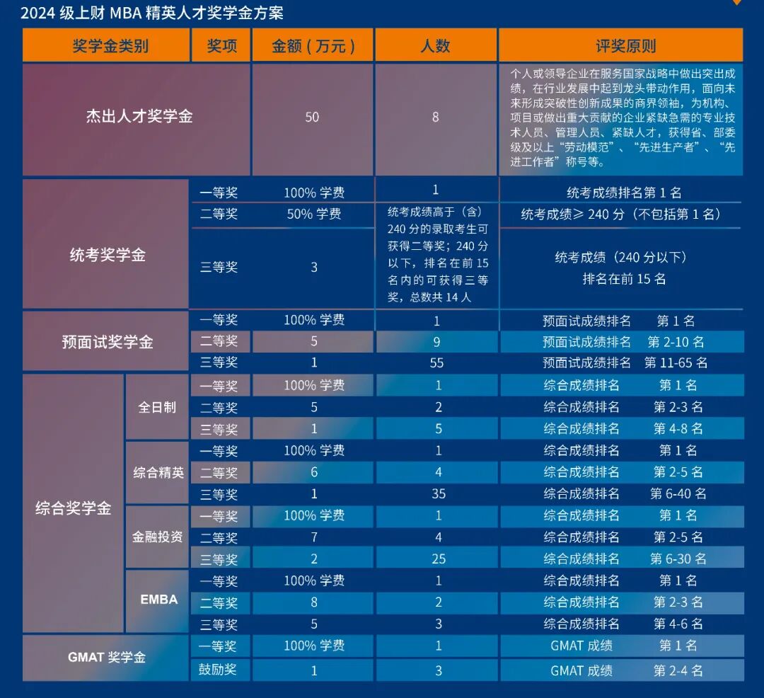 經(jīng)上海財(cái)經(jīng)大學(xué)商學(xué)院招生委員會(huì)審核通過,《2024級(jí)MBA/EMBA新生精英人才獎(jiǎng)學(xué)金方案》已經(jīng)正式公布!