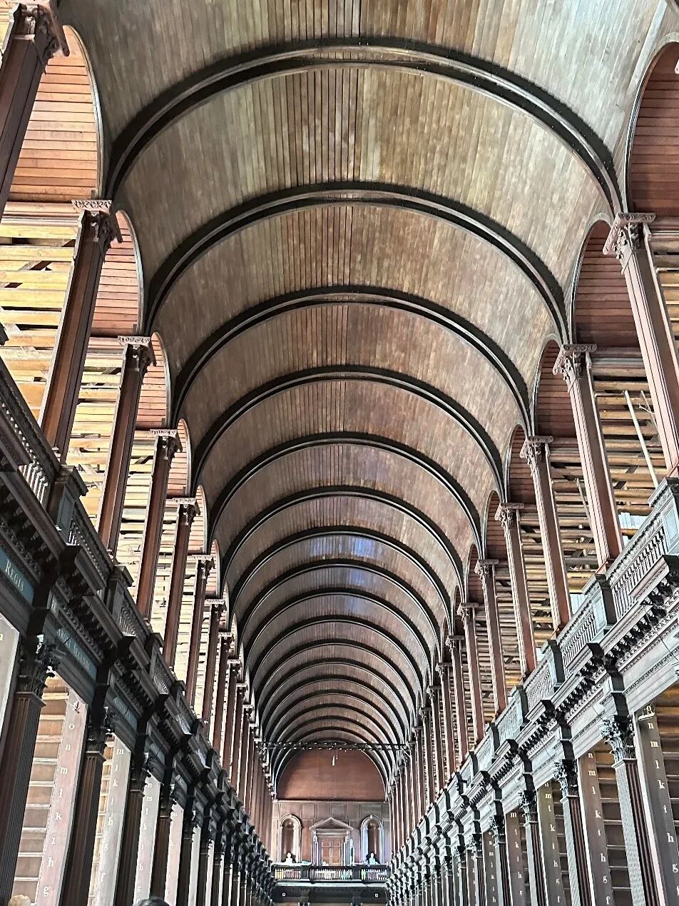 講座后,同學(xué)們跟隨圣三一大學(xué)同事,一起參觀了該校圖書館。圣三一大學(xué)不僅是愛爾蘭最古老的大學(xué),還擁愛爾蘭最古老的圖書館。該圖書館是世界上最大的單室圖書館之一,由伊麗莎白一世女王主持建于 1592年。圖書館擁有圣三一學(xué)院最古老的藏書,其中許多是愛爾蘭的國寶,以藏有超過20萬冊館內(nèi)最古老書籍的“長廳” (LongRoom)而聞名。長廳里收藏著其中一把愛爾蘭最古老的豎琴??勺匪莸?5世紀(jì),橡木豎琴是當(dāng)時愛爾蘭的典型象征。這座圖書館不但是《哈利波特》的拍攝取景地,還是《星球大戰(zhàn)》絕地武士檔案館的原型。