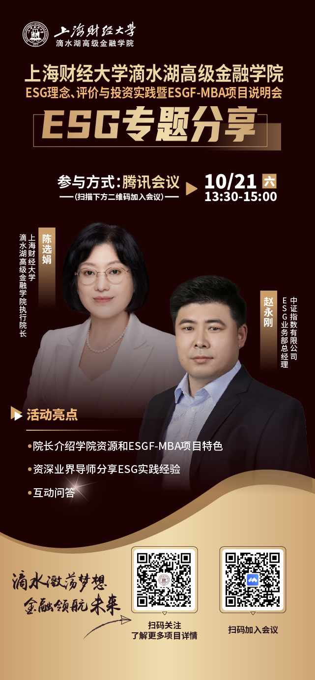 學(xué)院將于2023年10月21日(周六)13:30舉行上海財(cái)經(jīng)大學(xué)滴水湖高級(jí)金融學(xué)院非全日制工商管理碩士(ESGF-MBA)項(xiàng)目說明會(huì)。屆時(shí),重磅嘉賓將為大家?guī)?ESG理念、評(píng)價(jià)與投資實(shí)踐"主題演講。