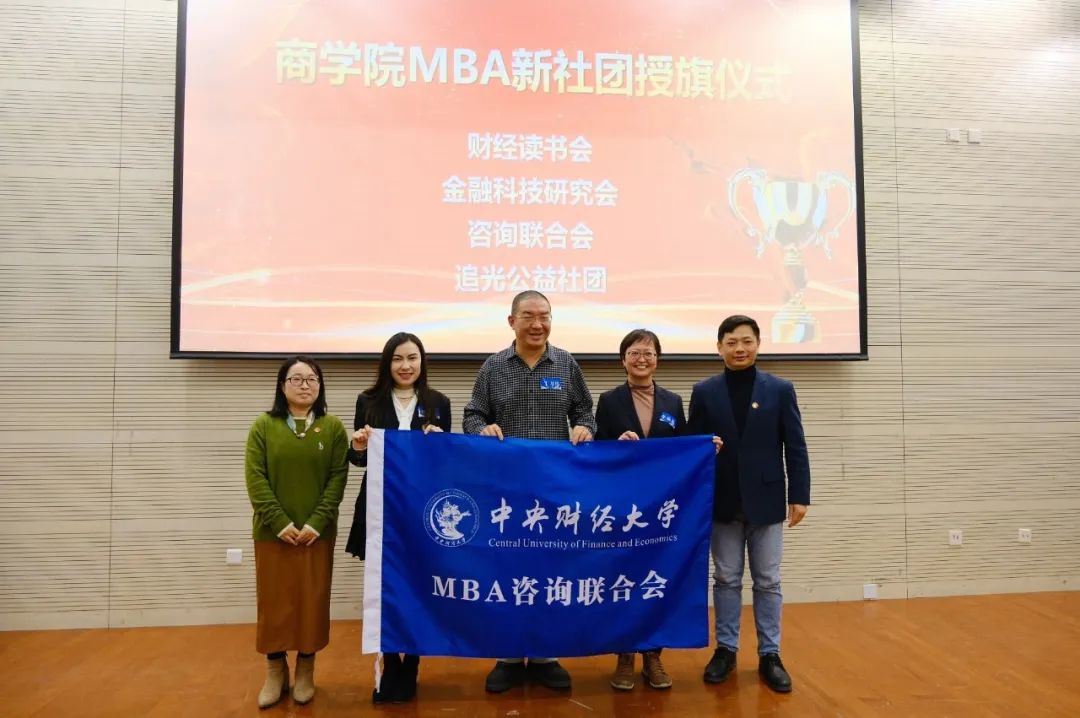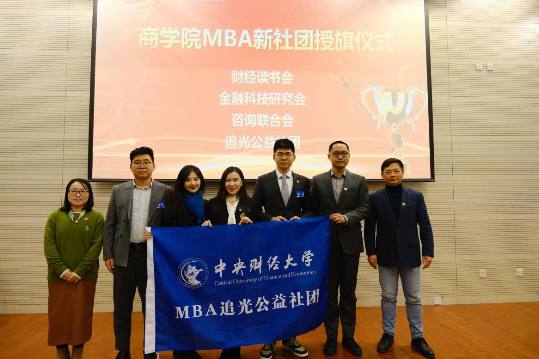 商學(xué)院黨委副書記楊中英、MBA教育中心副主任兼商學(xué)院副院長朱飛向MBA社團協(xié)會主要發(fā)起人邱瀅霏、李航、郭子瑤授旗。