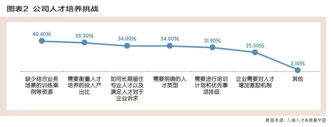報(bào)告顯示,“缺少結(jié)合業(yè)務(wù)場(chǎng)景的訓(xùn)練案例等資源”“需要衡量人才培養(yǎng)的投入產(chǎn)出比”“如何長(zhǎng)期留住專業(yè)人才以及滿足人才對(duì)于企業(yè)訴求”“需要明確的人才類型”等問題,在企業(yè)內(nèi)部的人才培養(yǎng)問題中,異常突出(圖表2)。