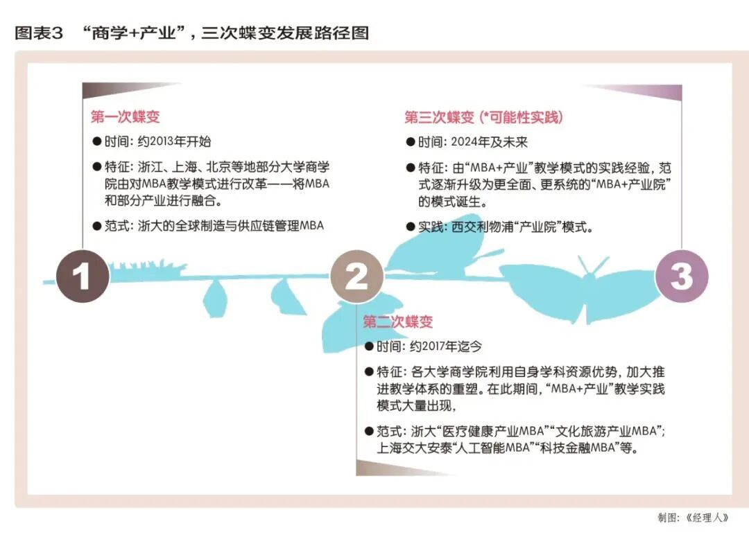 從“MBA+產(chǎn)業(yè)”模式在國(guó)內(nèi)第一次真正出現(xiàn),到發(fā)展,乃至未來趨勢(shì),有三次蝶變(包括預(yù)期即將發(fā)生;見圖表3):