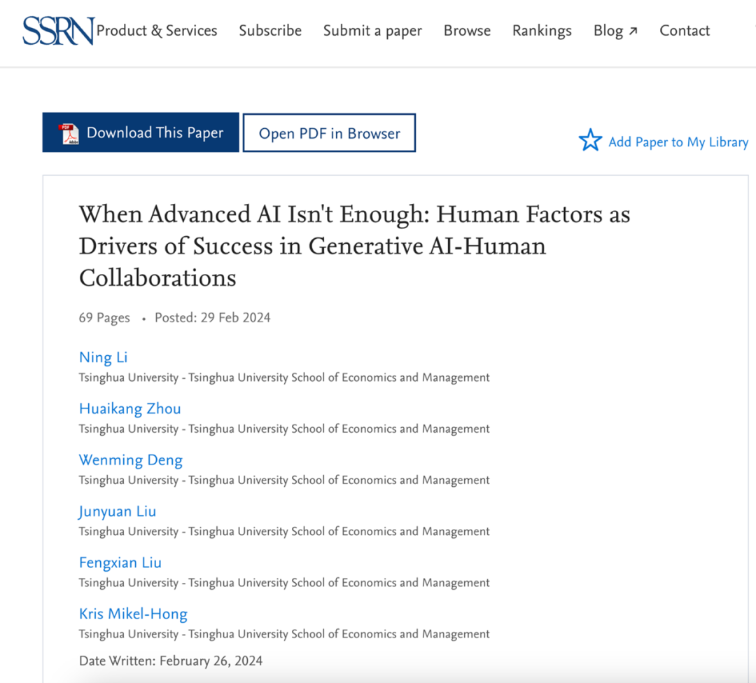 Li, Ning and Zhou, Huaikang and Deng, Wenming and Liu, Junyuan and Liu, Fengxian and Mikel-Hong, Kris, When Advanced AI Isn't Enough: Human Factors as Drivers of Success in Generative AI-Human Collaborations (February 26, 2024). Available at SSRN: https://ssrn.com/abstract=4738829orhttp://dx.doi.org/10.2139/ssrn.4738829