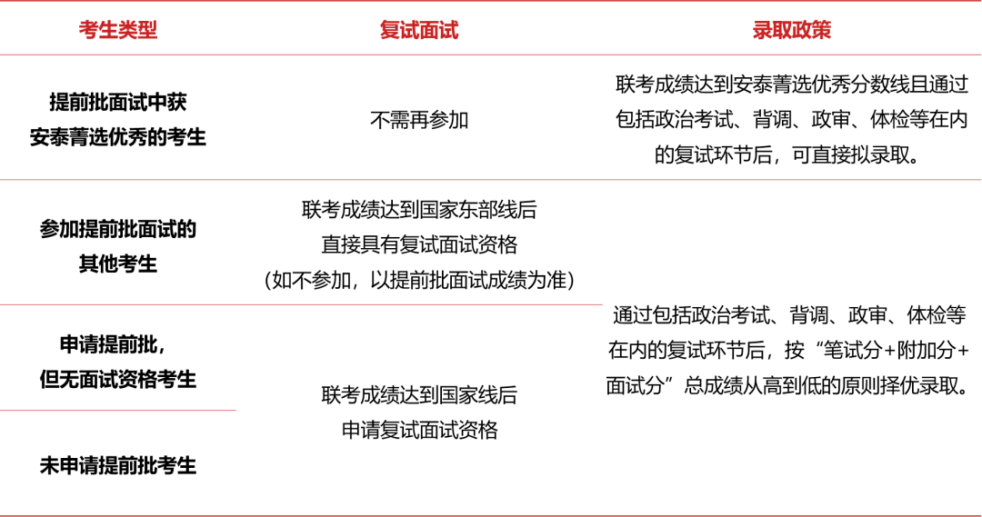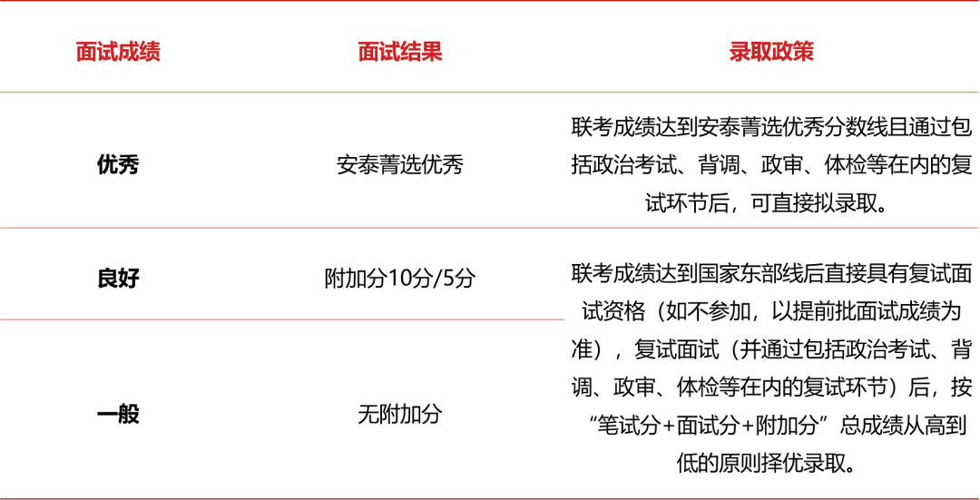 ①參加提前批面試獲得“安泰菁選優(yōu)秀”資格的考生,聯(lián)考成績達(dá)到安泰菁選優(yōu)秀分?jǐn)?shù)線且通過包括政治考試、背調(diào)、政審、體檢等在內(nèi)的復(fù)試環(huán)節(jié)后,可直接獲得擬錄取資格;