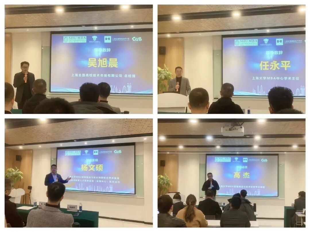 在開班儀式上,上海全國高校技術(shù)市場有限公司總經(jīng)理吳旭晨、上海大學(xué)MBA中心學(xué)術(shù)主任任永平、上海大學(xué)MBA智能制造與技術(shù)轉(zhuǎn)移聯(lián)合學(xué)術(shù)監(jiān)督、國家技術(shù)轉(zhuǎn)移人才培養(yǎng)基地(東部中心)執(zhí)行主任楊文碩、上海大學(xué)MBA智能制造與技術(shù)轉(zhuǎn)移學(xué)術(shù)監(jiān)督高杰出席并致辭。
