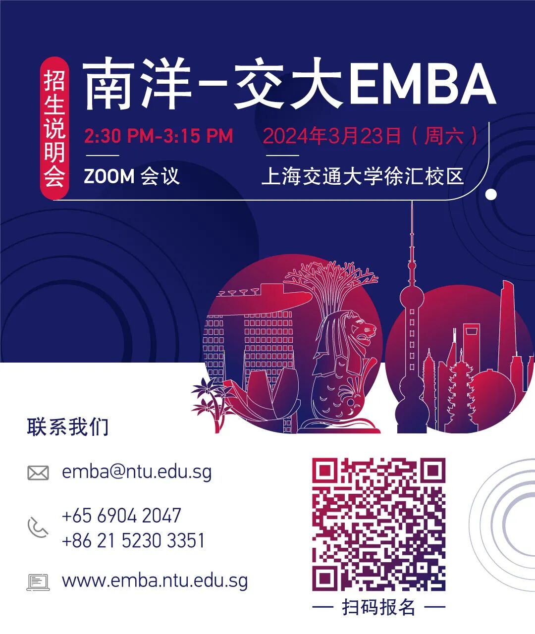為了幫助大家全面了解南洋理工大學(xué)中文 EMBA 項目(以下簡稱交大-南洋EMBA),我們將于2024年3月23日(星期六)下午2點30分召開2024年首場招生說明會,誠邀大家參加!