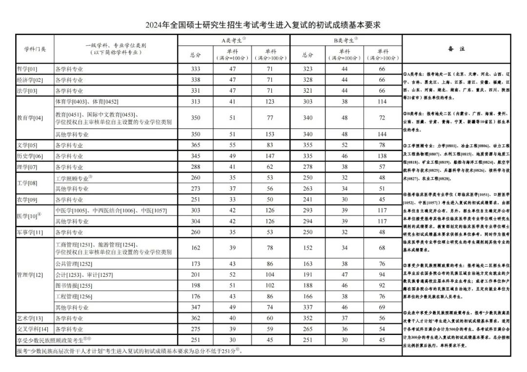 根據(jù)2024年全國碩士研究生招生考試考生進入復試的初試成績要求,我校制定碩士研究生招生考試復試分數(shù)線: