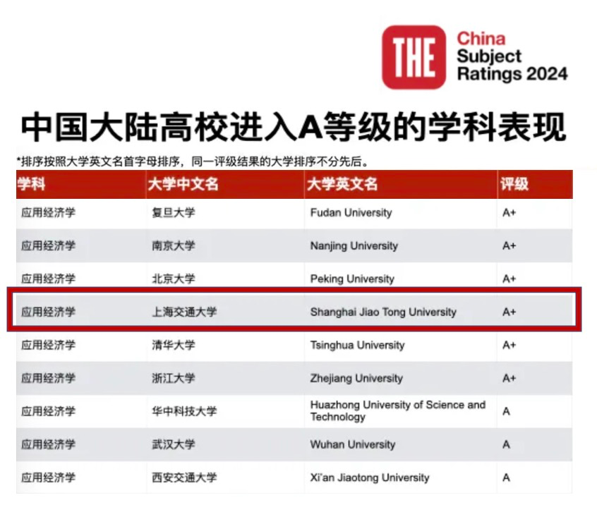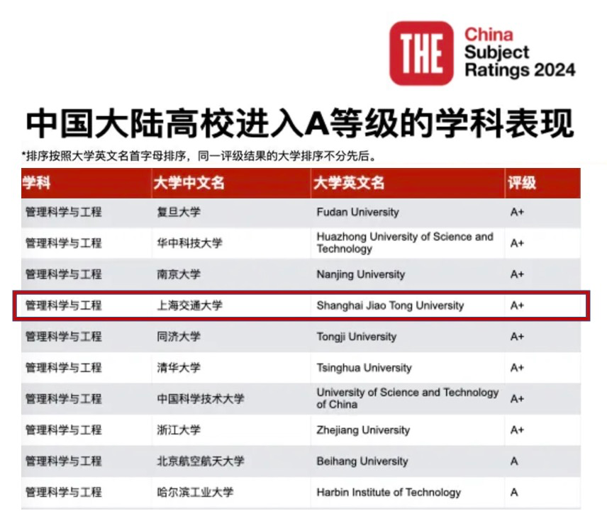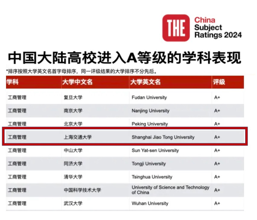 THE中國(guó)學(xué)科評(píng)級(jí)發(fā)布:交大安泰三個(gè)一級(jí)學(xué)科連續(xù)四年獲評(píng)A+