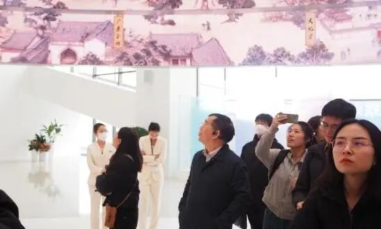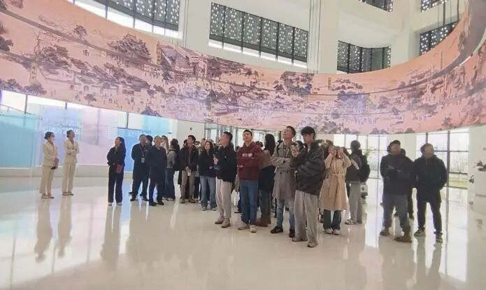 參訪伊始,充滿科技感的展示大廳映入眼簾,師生們欣賞了由藝術(shù)家與人工智能共同創(chuàng)造的新媒體藝術(shù)長卷《從天津衛(wèi)到天津未》。這樣一幅數(shù)字版的《清明上河圖》,以天津的城市圖景、經(jīng)典文化符號為創(chuàng)作基礎(chǔ),記錄了天津從近代到未來的不同地標(biāo)下的繁榮場景。