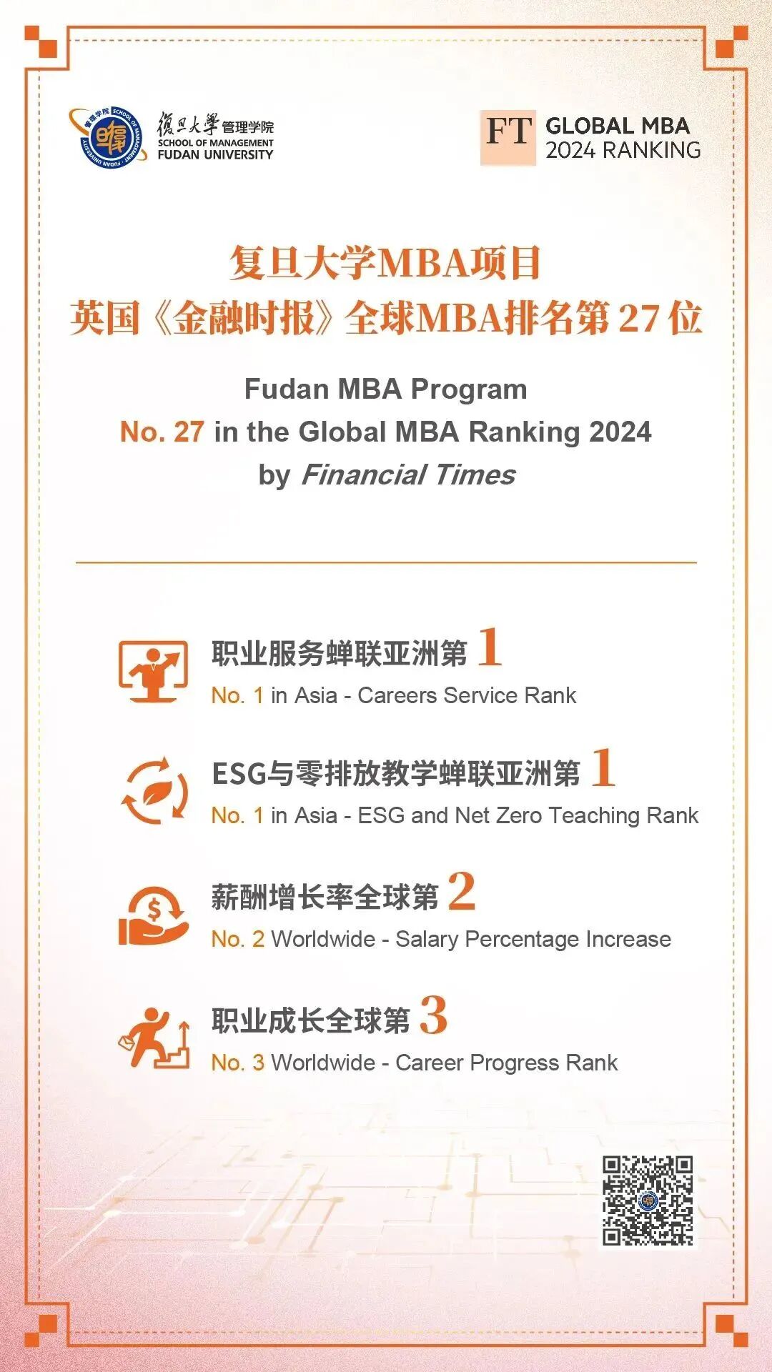 復(fù)旦MBA自1991年成立至今,歷經(jīng)三十多年的砥礪發(fā)展,已經(jīng)成為中國(guó)最具影響力的MBA項(xiàng)目之一。2023年,復(fù)旦管院榮獲環(huán)球教育“全球最佳商學(xué)院排名”中國(guó)內(nèi)地第1名,連續(xù)11次位列遠(yuǎn)東前三。2024年,復(fù)旦MBA項(xiàng)目位列《金融時(shí)報(bào)》(FT)全球MBA項(xiàng)目百?gòu)?qiáng)榜單全球第27位,其中“職業(yè)服務(wù)”和“ESG與零排放教學(xué)”蟬聯(lián)亞洲第1、“薪酬增長(zhǎng)率”位列全球第2、“職業(yè)成長(zhǎng)”位列全球第3。