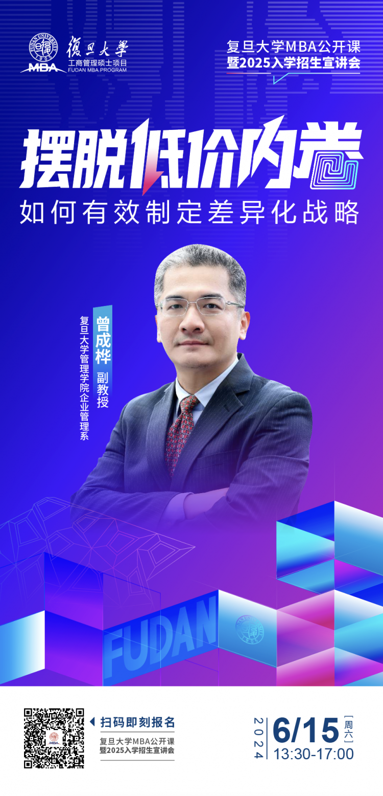 6月15日,復旦MBA特邀復旦大學管理學院曾成樺副教授開啟主題為《擺脫低價內(nèi)卷: 如何有效制定差異化戰(zhàn)略》的公開課,帶領大家一起探討如何從內(nèi)卷市場脫穎而出。