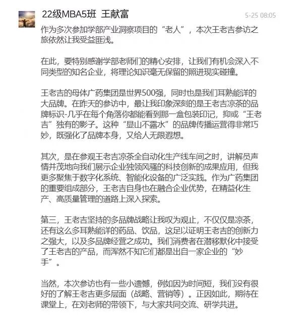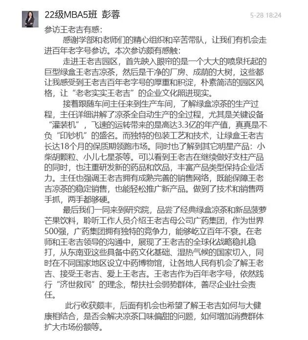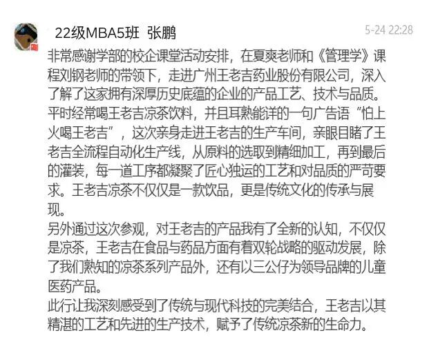 時(shí)維五月,淫雨霏霏。2024年5月24日下午,MBA《管理學(xué)》主講老師劉鋼教授、專業(yè)學(xué)位夏爽老師帶領(lǐng)2022級(jí)30余名同學(xué)冒雨前往廣州王老吉藥業(yè)股份有限公司(以下簡稱“王老吉藥業(yè)”)參觀交流。