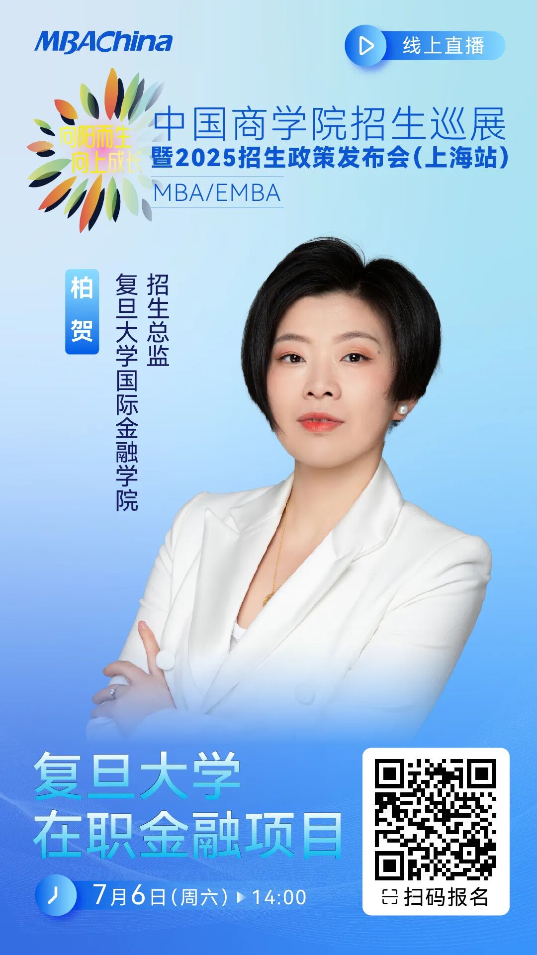 7月6日 |復(fù)旦大學(xué)國際金融學(xué)院在職金融MBA招生總監(jiān)柏賀邀您參加中國商學(xué)院招生巡展暨2025招生政策發(fā)布會(上海站)