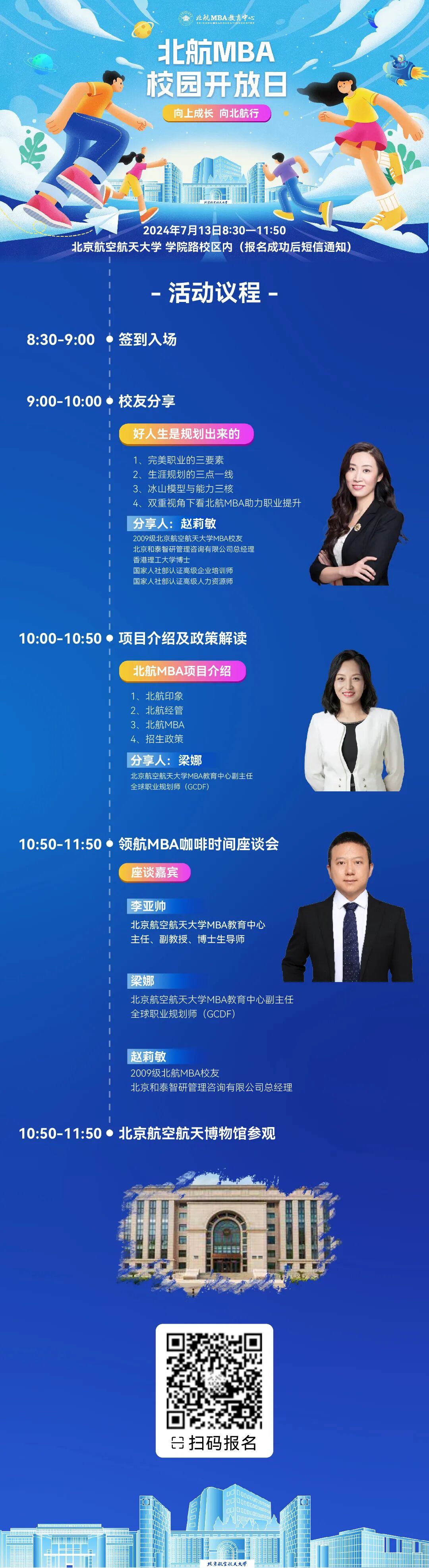 現(xiàn)在,北航MBA校園開放日的報名通道已開啟。這是一次不容錯過的機會,也將是一次深刻而寶貴的經(jīng)歷。加入這場智慧與成長的盛宴,與我們一起,駛向心中的星辰大海!