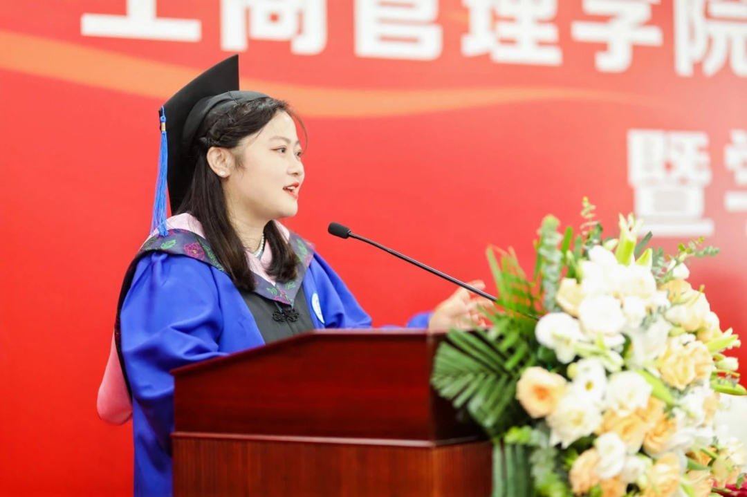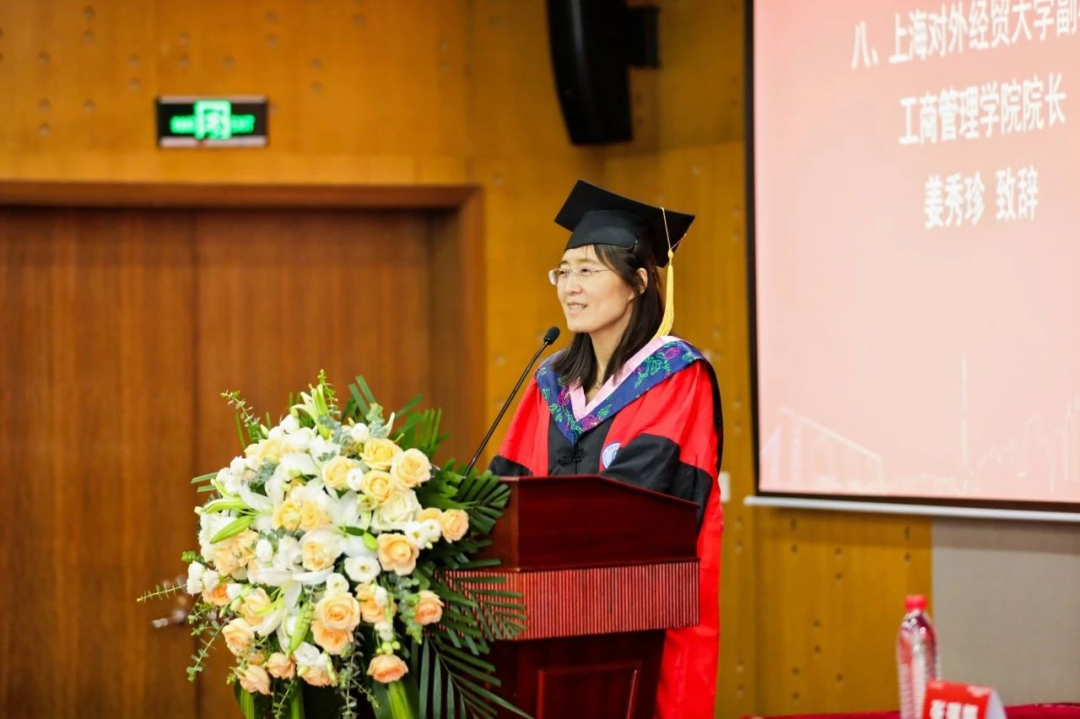 上海對(duì)外經(jīng)貿(mào)大學(xué)副校長(zhǎng)、工商管理學(xué)院院長(zhǎng)姜秀珍首先代表學(xué)院致辭。姜教授回顧了同學(xué)們?cè)谛F陂g的時(shí)光,對(duì)大家在學(xué)習(xí)、實(shí)踐中的辛勤付出和取得的優(yōu)異成績(jī)給予了高度肯定。她強(qiáng)調(diào),每一位同學(xué)的成長(zhǎng)與蛻變,都是學(xué)院教育理念的最好體現(xiàn)。