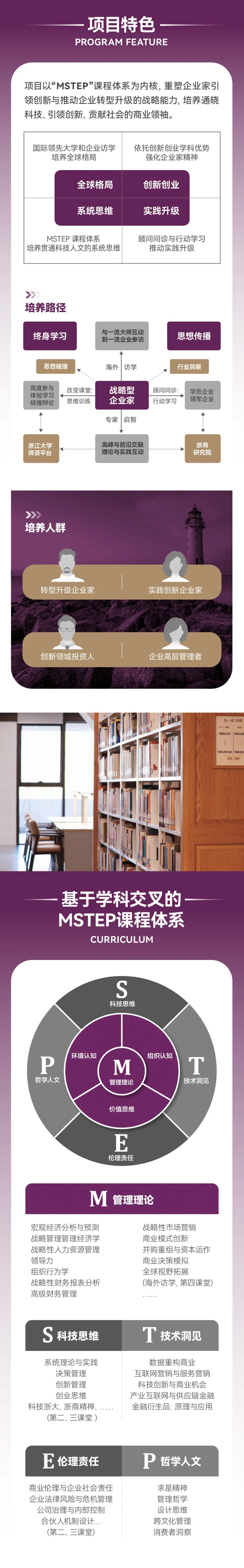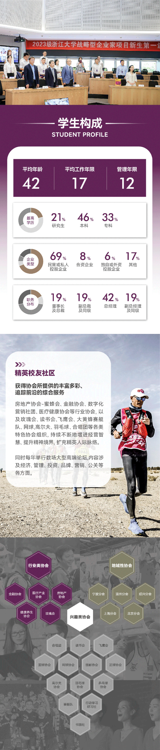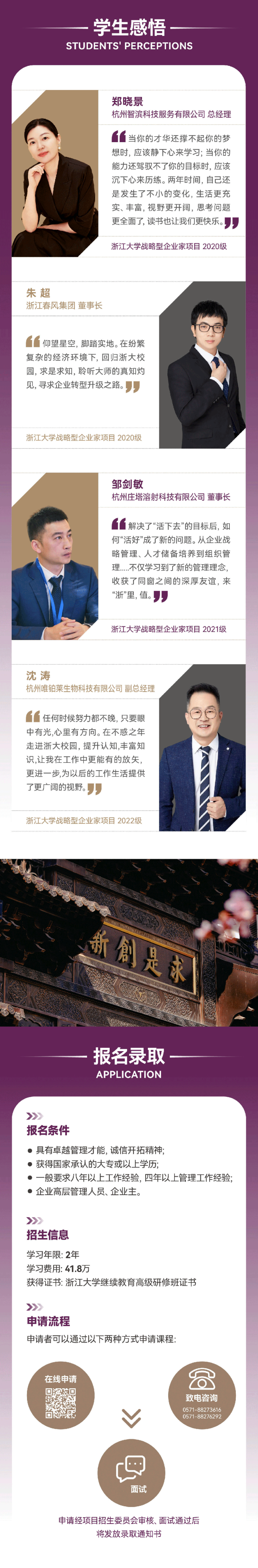 浙江大學(xué)戰(zhàn)略型企業(yè)家項(xiàng)目是浙江大學(xué)管理學(xué)院傾力打造的跨界融合高端企業(yè)家教育項(xiàng)目,旨在培養(yǎng)引領(lǐng)中國發(fā)展的戰(zhàn)略型企業(yè)家,希望可以幫助中國企業(yè)在這場波瀾壯闊的商業(yè)大潮中,捕捉到那些瞬間即逝的機(jī)遇,更好迎接未知的挑戰(zhàn)!