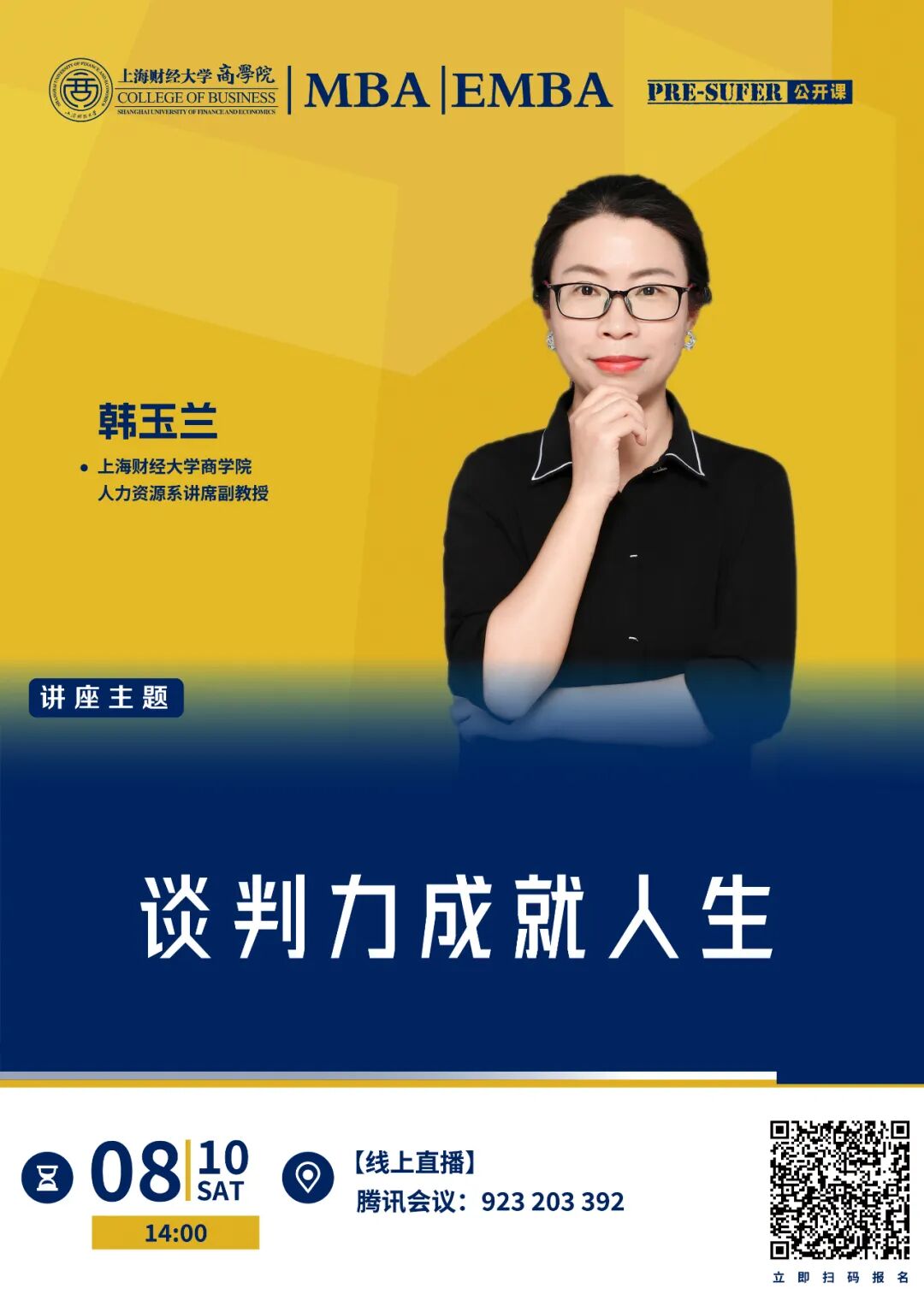 8月10日14:00,讓我們相約2025級Pre-sufer公開課暨2025年入學(xué)MBA/EMBA項(xiàng)目介紹及招生政策解析——《談判力成就人生》課堂,由上海財(cái)經(jīng)大學(xué)商學(xué)院人力資源系講席副教授韓玉蘭老師為大家揭示談判的奧秘。在這堂公開課中,韓老師將深入探討談判的精髓,從心理博弈到策略布局,從溝通技巧到情緒管理,全方位解鎖談判力的奧秘。無論您是職場精英,還是創(chuàng)業(yè)新秀,亦或是渴望在生活中更加游刃有余的智者,這里都有您不可錯過的智慧寶藏。讓我們一同學(xué)習(xí)如何以談判力為翼、飛越障礙,成就更加輝煌的人生篇章!