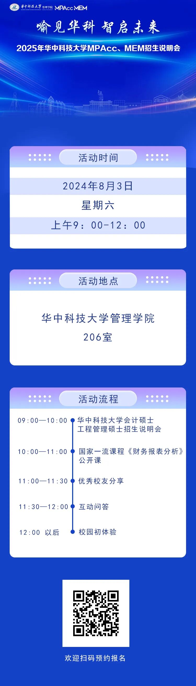 8月3日,華中科技大學(xué)MPAcc、MEM招生說明會暨M(jìn)PAcc財務(wù)官研習(xí)營、MEM項目管理研學(xué)營活動將在管理學(xué)院舉辦。