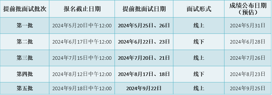 2025級(jí)提前批面試目前計(jì)劃2024年5月至9月共五個(gè)批次,面試形式將采用線上及線下結(jié)合的方式。