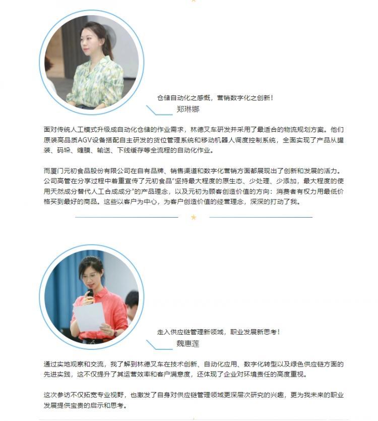 第二天的課程,許志端帶領(lǐng)學生們參觀了入選2023年全國供應鏈創(chuàng)新與應用示范企業(yè)的元初食品。