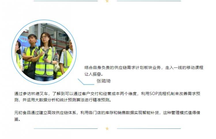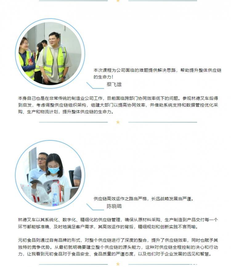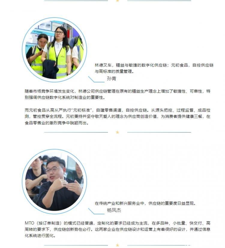 本次課程選擇了林德叉車及元初食品兩家優(yōu)秀企業(yè)供應鏈作為參訪調(diào)研對象,從制造業(yè)和服務業(yè)兩個不同角度感受了供應鏈創(chuàng)新與應用實踐的豐富多彩,既有自頂向下的總體架構(gòu)設(shè)計,也有自底向上的細節(jié)創(chuàng)新實踐,同時,云計算、區(qū)塊鏈、大數(shù)據(jù)、人工智能、物聯(lián)網(wǎng)等新技術(shù)的發(fā)展也為供應鏈創(chuàng)新提供了強大的支持。當前,百年未有之大變局加速演進,全球產(chǎn)業(yè)分工動能不足,國際貿(mào)易和全球投資連續(xù)承壓,企業(yè)面臨著更加不確定的運營環(huán)境,市場需求日益多樣化、個性化,如何實現(xiàn)供需精準、高效的匹配,唯有不斷深化供應鏈創(chuàng)新與應用!
