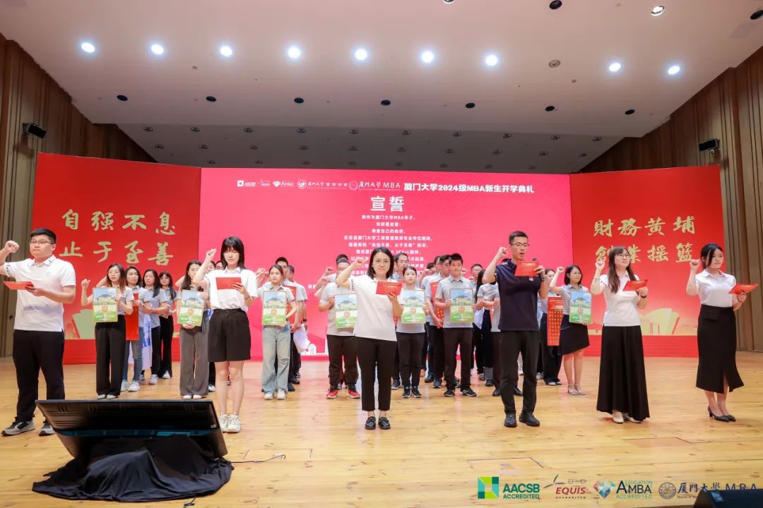 在第十九屆MBA聯(lián)合會主席團、聯(lián)合會成員及臺上新生代表的帶領(lǐng)下,全體24級學(xué)生莊嚴宣誓,奏唱校歌。自此,每一位24級新生將謹記自己“廈大人,管院人,MBA人”的身份,在這充滿希望和挑戰(zhàn)的新起點,腳踏實地,筑夢啟航。