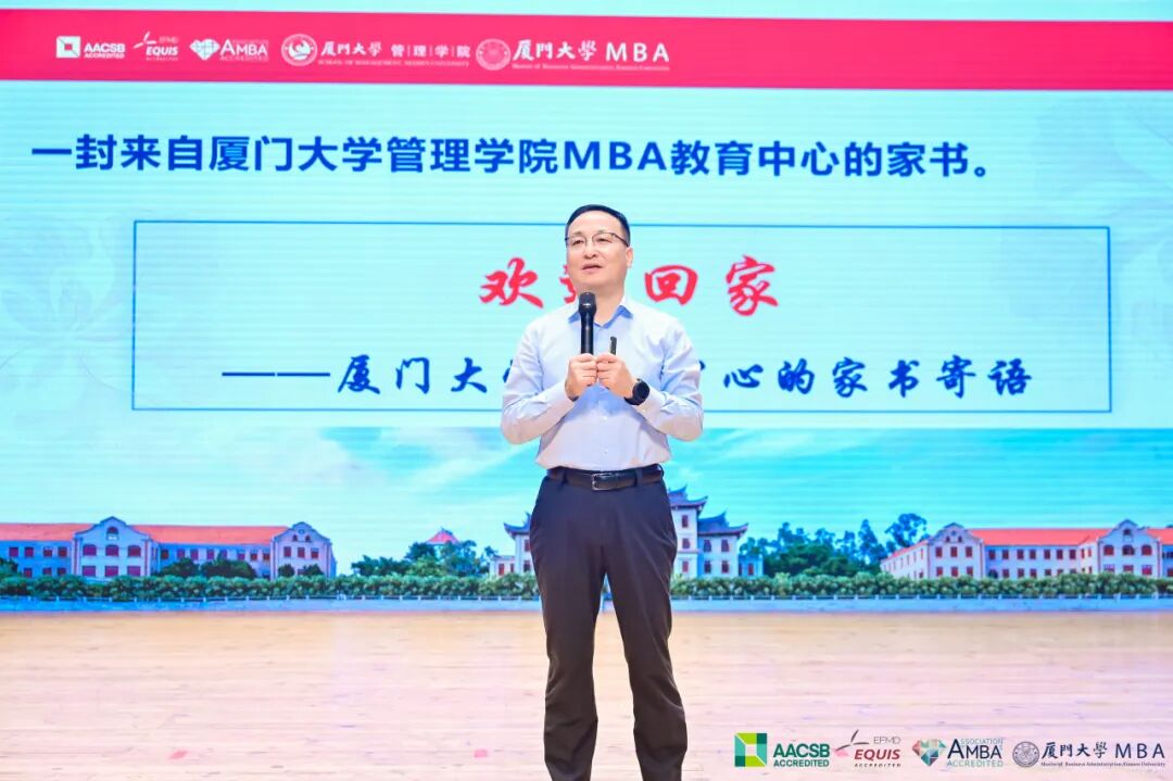 屈文洲通過一封家書,將廈門大學(xué)MBA的歷史娓娓道來。家書中寫明了廈大MBA悠久的辦學(xué)歷史,感恩務(wù)實的家風(fēng),向上向善的家族理念,先進的培養(yǎng)目標以及MBA項目宗旨,描繪出廈大MBA項目的精神傳承。我們不僅傳播知識還傳播精神,讓24級新生體會到有一種幸福叫我在廈大。發(fā)言最后,他祝愿大家永葆初心、持續(xù)奮斗;不負初心,不辱使命,做自己的“大圣”。