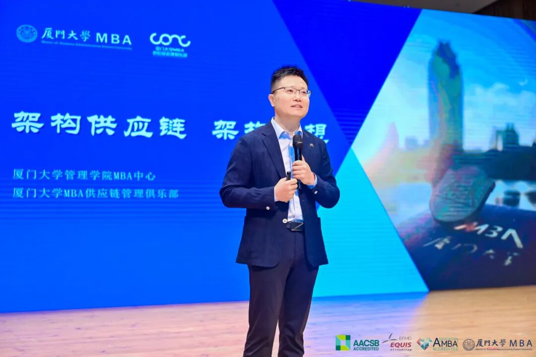 施云以“架構(gòu)供應(yīng)鏈,架構(gòu)夢想”為主題,首先從宏觀環(huán)境角度、國家層面和產(chǎn)業(yè)鏈供應(yīng)鏈視角分析烏卡時代供應(yīng)鏈所面臨的機遇和挑戰(zhàn),并運用實際案例告訴我們?nèi)绾卧谧兓臅r代做好供應(yīng)鏈。以“眼一腦一身”的結(jié)構(gòu)生動形象地講解了什么是智慧供應(yīng)鏈以及如何架構(gòu)智慧供應(yīng)鏈。最后,通過麥當勞智慧供應(yīng)鏈的實踐,傳達了共生共贏的三角凳文化。同時,施云也通過自己如何架構(gòu)自己MBA學(xué)習(xí)之路,為24級學(xué)弟學(xué)妹指引學(xué)習(xí)方向。我們渴望為光,也更要以光為榜樣。