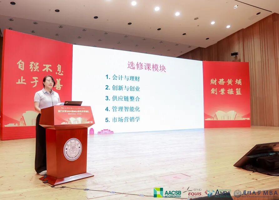 典禮開始,袁喜娜為新生介紹了到場嘉賓,他們的到來無疑是對新同學(xué)們最好的鼓勵和支持。隨后,她向大家展示了廈門大學(xué)MBA的師資陣容。從管理經(jīng)濟學(xué)到市場營銷,從財務(wù)會計到戰(zhàn)略管理等,每一位教師都是各自領(lǐng)域內(nèi)的佼佼者,將指引學(xué)生探索未知世界。相信在未來的學(xué)習(xí)生涯中,新同學(xué)們定能在這片知識的海洋里揚帆起航。
