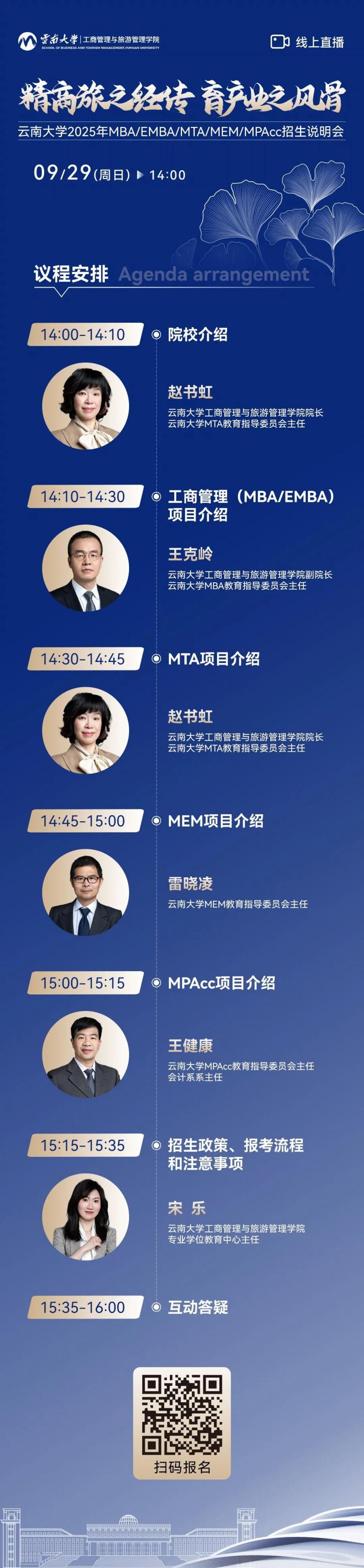 直播預(yù)告 | 9月29日,云南大學(xué)2025年MBA/EMBA/MTA/MEM/MPAcc招生說明會(huì)即將開啟!