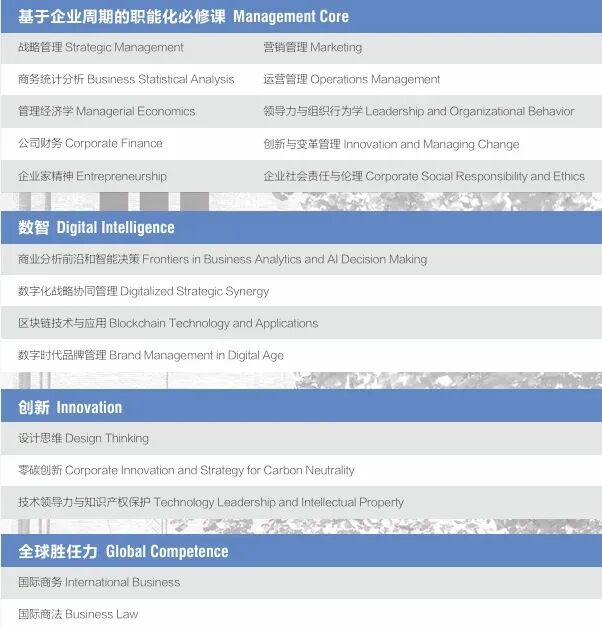 課程模塊以數(shù)字化和人工智能發(fā)展為背景,設(shè)計(jì)了基于企業(yè)生命周期的職能化必修課和以數(shù)智創(chuàng)新為導(dǎo)向的模塊化選修課的雙輪課程體系。一方面項(xiàng)目以企業(yè)生命周期為主線,囊括不同階段企業(yè)經(jīng)營(yíng)管理基礎(chǔ)技能和管理能力,另一方面以數(shù)智模塊、創(chuàng)新模塊、全球勝任力模塊特色化模塊探索未來(lái)技術(shù)趨勢(shì)和企業(yè)發(fā)展模式。