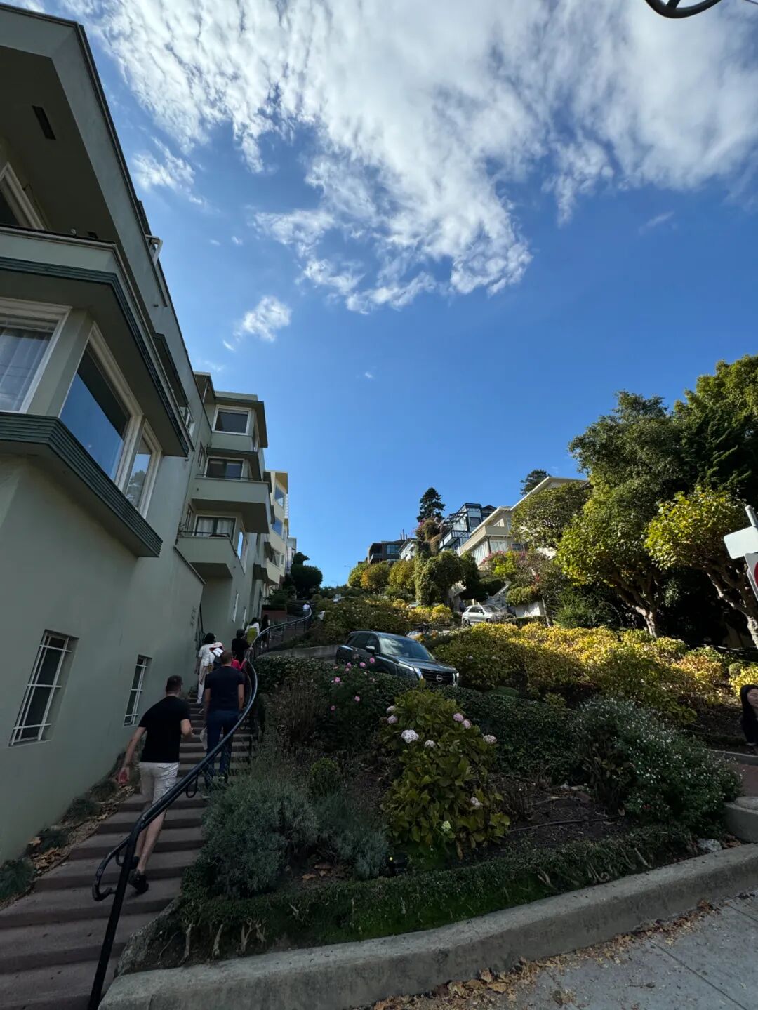 九曲花街以其40度的斜坡,且彎曲像“Z”字形而聞名。這一段路有八個(gè)急轉(zhuǎn)彎,市政當(dāng)局為了防止交通事故,特意修筑花壇,車行至此,只能盤旋而下,時(shí)速不得超過5英里,這段街道因此有“世界上最彎曲的街道”之稱。游學(xué)團(tuán)順著花街兩旁的人行步道拾級(jí)而上,欣賞美麗景色,也親身感受這段路的陡峭。街道上遍植花木,而至此時(shí)節(jié),已然西風(fēng)亂葉溪橋樹,秋在黃花羞澀處。在花街高處還能遠(yuǎn)眺海灣大橋和科伊特塔。