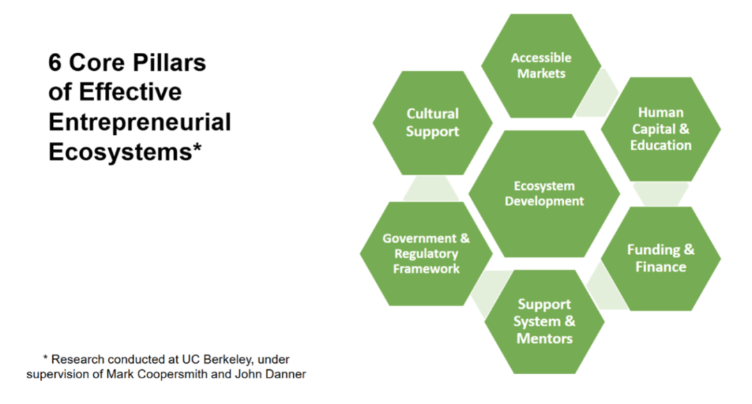 Mark Coopersmith教授對(duì)于硅谷創(chuàng)業(yè)生態(tài)的六大支柱概括為文化支持、政府和合規(guī)框架、市場(chǎng)準(zhǔn)入、人力資源和教育、投融資和支持系統(tǒng)。也正是因?yàn)檫@樣的生態(tài)支持,使得加州從早期淘金熱而發(fā)展起來(lái)的西部荒野逐漸變成了全美高科技公司和創(chuàng)業(yè)公司的大本部,使得惠普在帕拉阿圖的車庫(kù)中誕生,使得威廉·肖克力在硅谷創(chuàng)辦半導(dǎo)體晶體管實(shí)驗(yàn)室,使得仙童半導(dǎo)體公司成功誕生,也使得像英特爾、蘋果等一大批全球頂尖的企業(yè)創(chuàng)建和發(fā)展。