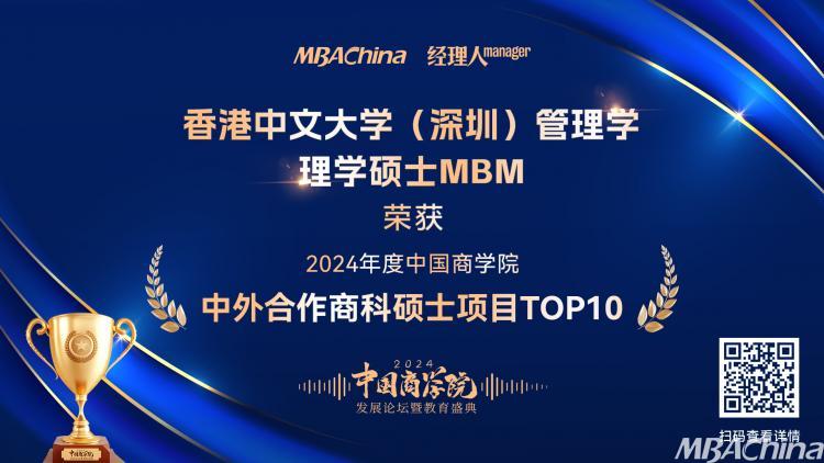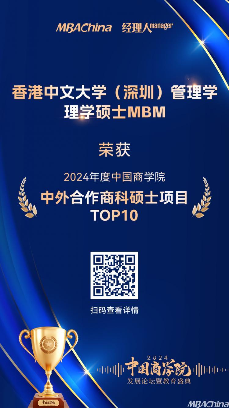 香港中文大學(xué)(深圳)管理學(xué)理學(xué)碩士MBM項(xiàng)目榮獲“2024年度中國(guó)商學(xué)院中外合作商科碩士項(xiàng)目TOP10”第1名!