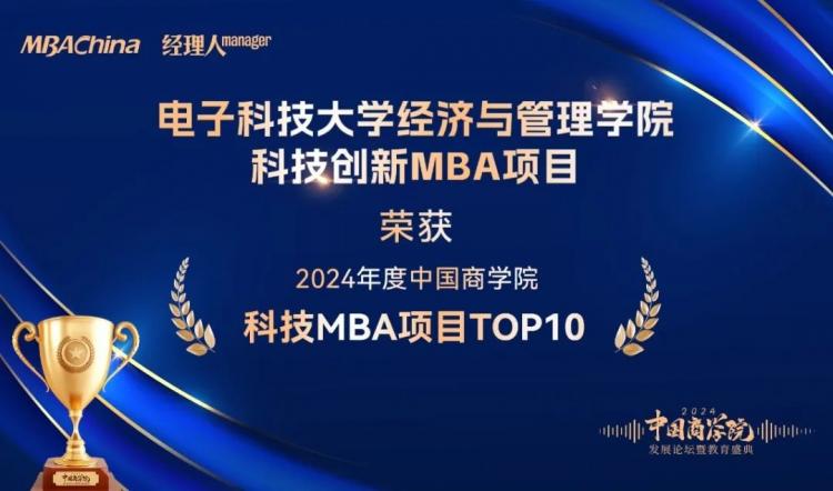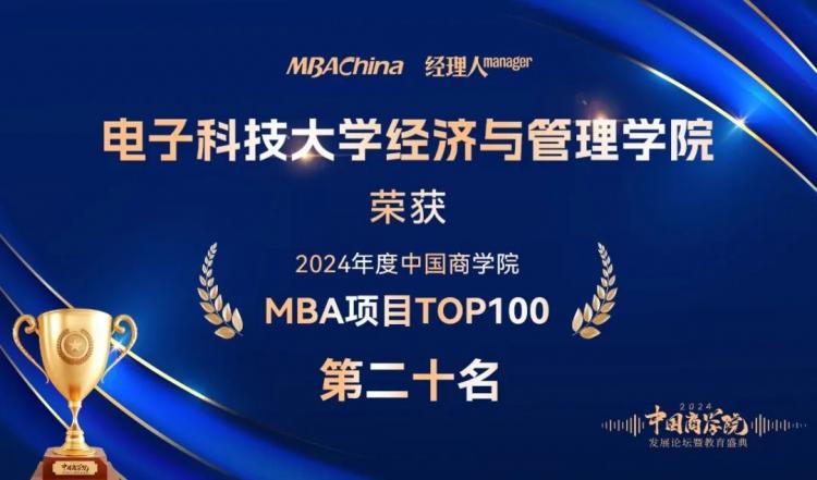 電子科技大學經濟與管理學院MBA項目榮獲“2024年度中國商學院最佳MBA項目TOP 100第20名(四川地區(qū)第一名)”??萍紕?chuàng)新MBA方向榮獲2024年度中國商學院科技MBA項目TOP10,戰(zhàn)略與可持續(xù)發(fā)展MBA方向榮獲2024年度中國商學院特色MBA項目獎。