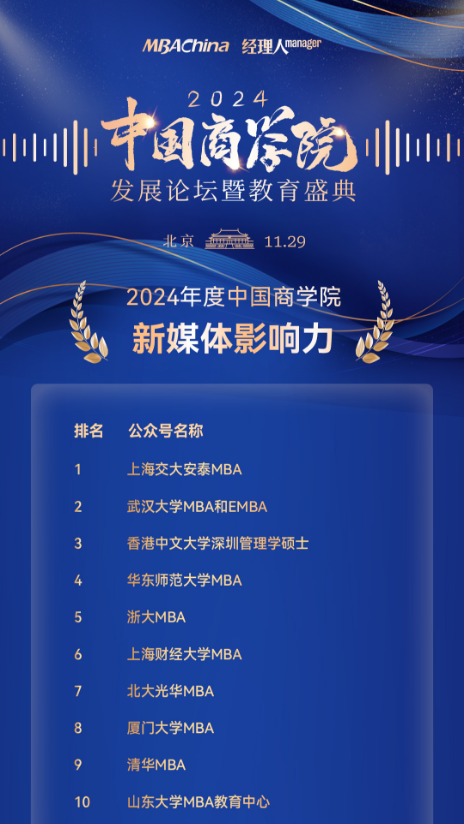 “2024年度中國商學(xué)院新媒體影響力榜單”由MBAChina與《經(jīng)理人》雜志共同評選,旨在表彰那些在新媒體傳播領(lǐng)域展現(xiàn)出卓越影響力與創(chuàng)新力的商學(xué)院。他們不僅在傳統(tǒng)教育領(lǐng)域深耕細(xì)作,更勇于擁抱新媒體的浪潮,以創(chuàng)新的思維和手段,成功構(gòu)建了與社會(huì)各界的深度連接,為商科教育的傳播與推廣開辟了新的路徑。