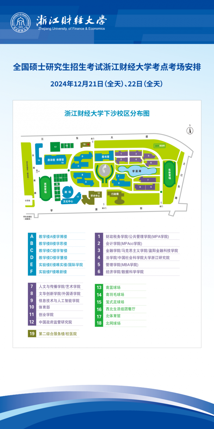 考場(chǎng)安排在浙江財(cái)經(jīng)大學(xué)下沙校區(qū)A、B、C、D教學(xué)樓,考場(chǎng)距離學(xué)校南大門步行5分鐘左右。我??键c(diǎn)考場(chǎng)分布圖如下: