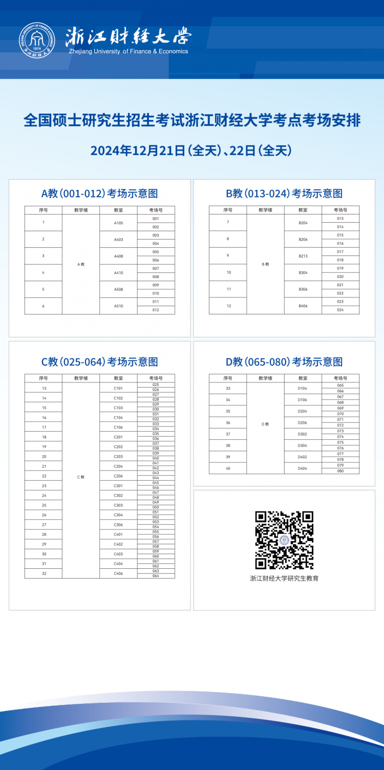 2025年全國(guó)碩士研究生招生考試將于2024年12月21日至22日舉行,浙江財(cái)經(jīng)大學(xué)考點(diǎn)共設(shè)有80個(gè)考場(chǎng),考點(diǎn)位于浙江財(cái)經(jīng)大學(xué)下沙校區(qū)(杭州市下沙高教園區(qū)學(xué)源街18號(hào)),外??忌殢哪洗箝T(南1門)西側(cè)進(jìn)出,校內(nèi)考生從西大門進(jìn)出。為了確保考生順利應(yīng)試,請(qǐng)考生認(rèn)真閱讀以下內(nèi)容:
