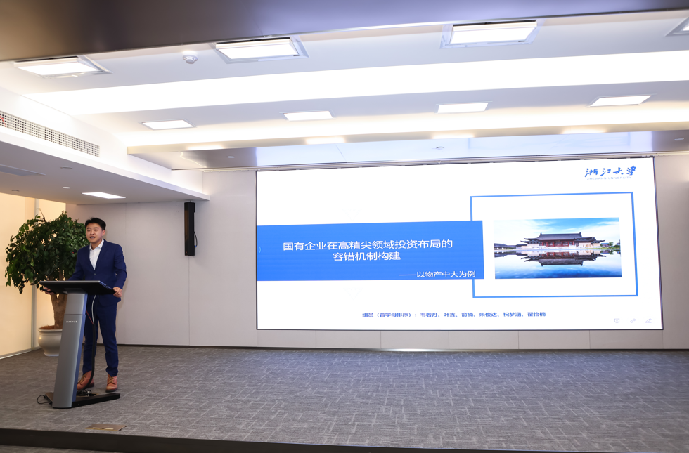 第八組則圍繞 “國有企業(yè)在高精尖領(lǐng)域投資布局的容錯機(jī)制構(gòu)建--以物產(chǎn)中大為例” 展開研究,在指導(dǎo)老師張小林的助力下,組員韋若丹、葉鑫、俞楠、朱俊達(dá)、祝夢涵、翟怡楠及物產(chǎn)中大成員陳瀛、龔森森、洪禹旻、蔣京丹、盧一思、王芳芳、楊必來深入分析。該課題符合國家鼓勵國企創(chuàng)新發(fā)展的戰(zhàn)略導(dǎo)向,為物產(chǎn)中大在高精尖產(chǎn)業(yè)的投資決策提供了制度創(chuàng)新的思路,助力企業(yè)突破創(chuàng)新瓶頸,勇闖科技產(chǎn)業(yè)的無人區(qū),提升了核心競爭力,引領(lǐng)了行業(yè)的創(chuàng)新風(fēng)尚。