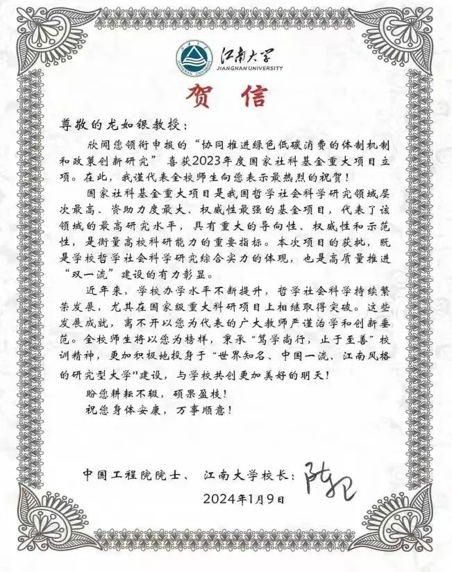校長陳衛(wèi)向商學院“2023年度國家社科基金重大項目立項”教師致賀信
