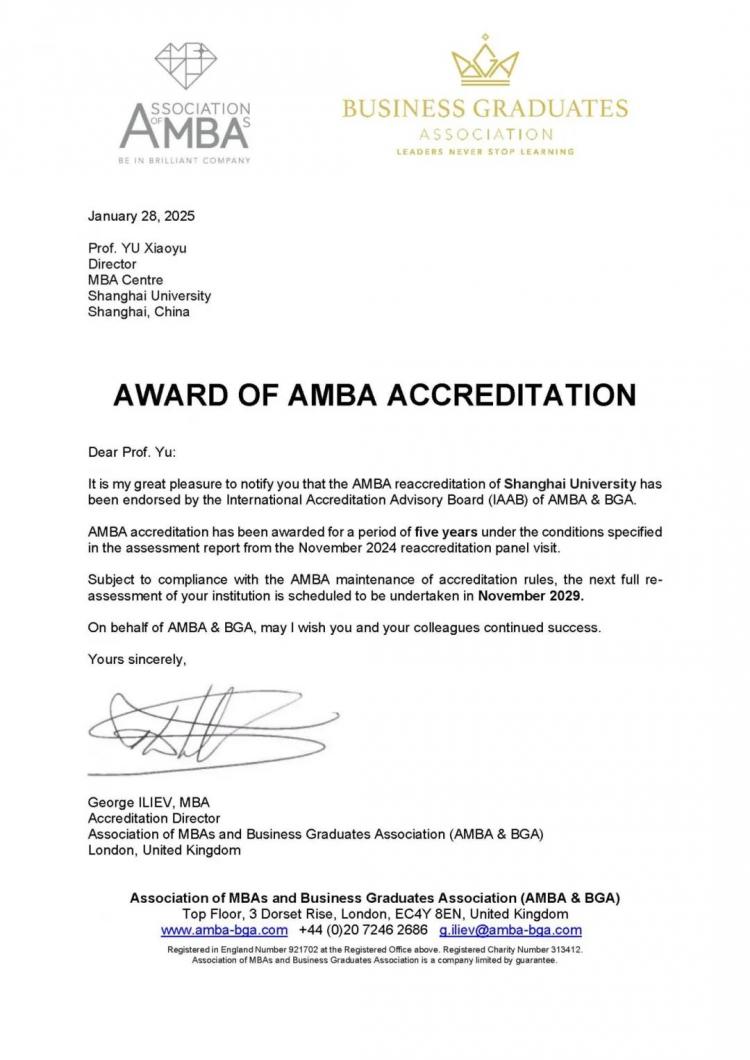 2025年1月29日,上海大學(xué)MBA中心正式收到國(guó)際三大商學(xué)教育權(quán)威認(rèn)證組織之一英國(guó)工商管理碩士協(xié)會(huì)(Association of MBAs, 簡(jiǎn)稱AMBA)的賀信,宣布上海大學(xué)MBA中心成功通過(guò)了AMBA2024的再認(rèn)證,且獲得了五年最高期限。這是繼2017年首次獲得三年有條件認(rèn)證、2020年獲得五年(3年+2年)有條件再認(rèn)證后的又一里程碑式成就。