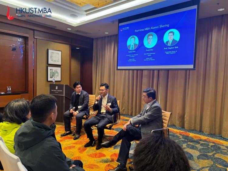 除主題分享外,活動(dòng)還特別邀請(qǐng)了兩位校友: 2020級(jí)港科大MBA單周班校友Ezekiel Chim (圖左),現(xiàn)任埃森哲(Accenture)Ecosystem Sales Director、以及2021年港科大MBA雙周班校友Frank Zhai (圖中),現(xiàn)任蘋果公司(Apple)Operations Manager ——與在場(chǎng)參與或活動(dòng)的人員進(jìn)行交流。兩位校友分別分享了自己在港科大MBA的學(xué)習(xí)經(jīng)歷及收獲,生動(dòng)講述了該項(xiàng)目如何為他們提供了實(shí)用的商業(yè)知識(shí)、提升了領(lǐng)導(dǎo)能力,并幫助他們?cè)诼殘?chǎng)中實(shí)現(xiàn)突破。