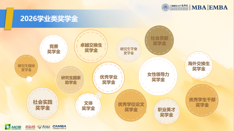 上財商學(xué)院MBA/EMBA為學(xué)生設(shè)置了豐富的獎學(xué)金,包含“精英人才獎學(xué)金”與“學(xué)業(yè)類獎學(xué)金”兩類。