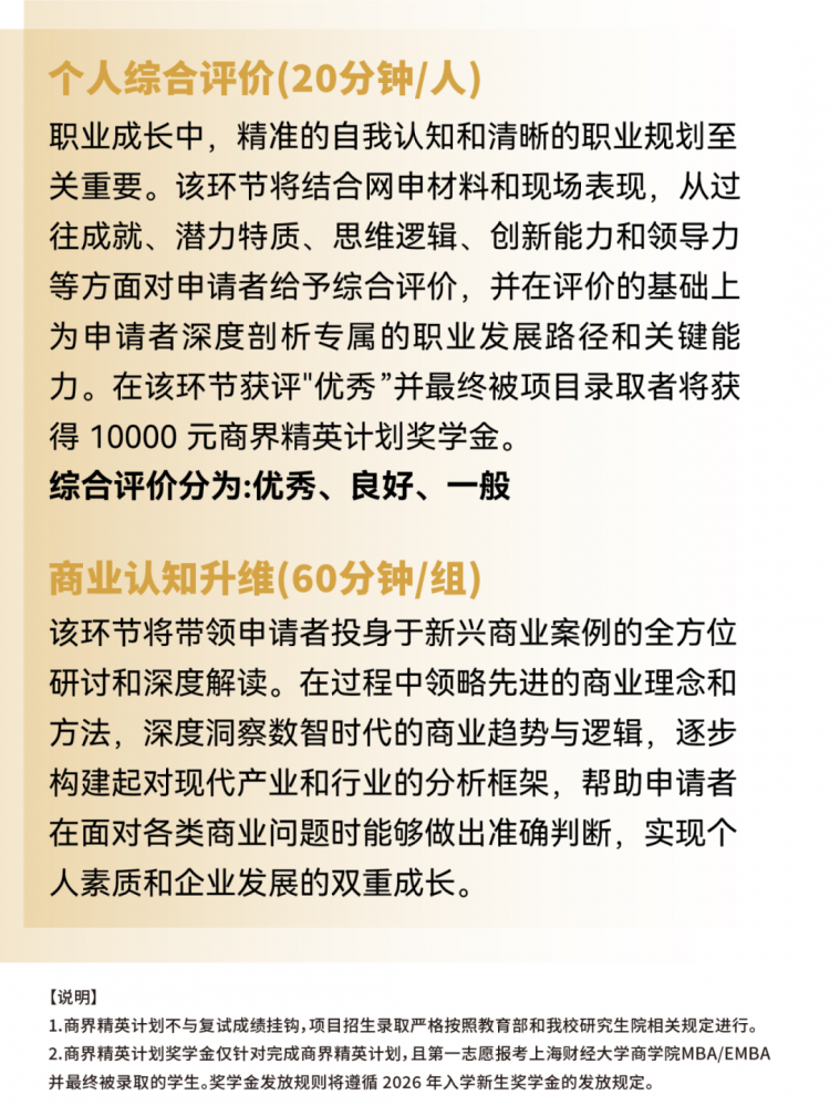 為考生打造一段深度的能力提升之旅。該計劃通過“個人綜合評價”和“商業(yè)認知升維”兩大模塊,助力考生實現(xiàn)職業(yè)素養(yǎng)升級和思維鍛煉,進而更好地促進個人成長和企業(yè)發(fā)展。