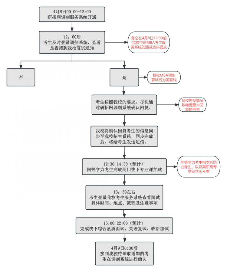 1.研招網(wǎng)調(diào)劑服務(wù)系統(tǒng)將于4月8日開通,我校開放調(diào)劑系統(tǒng)持續(xù)時(shí)間為12個(gè)小時(shí)。請(qǐng)考生盡早提交我校調(diào)劑志愿,并于4月8日12:00之后,及時(shí)登錄調(diào)劑系統(tǒng),查看是否接到我校復(fù)試通知。如接到復(fù)試通知,請(qǐng)考生按照我校的要求,盡快確認(rèn)復(fù)試通知,以便安排后續(xù)考核流程。同時(shí),務(wù)請(qǐng)考生提前按照本文“三、調(diào)劑前準(zhǔn)備”的要求,完成中財(cái)MBA考生服務(wù)系統(tǒng)的面試資料填報(bào),并確保此時(shí)“資料審核”狀態(tài)為“通過”。
