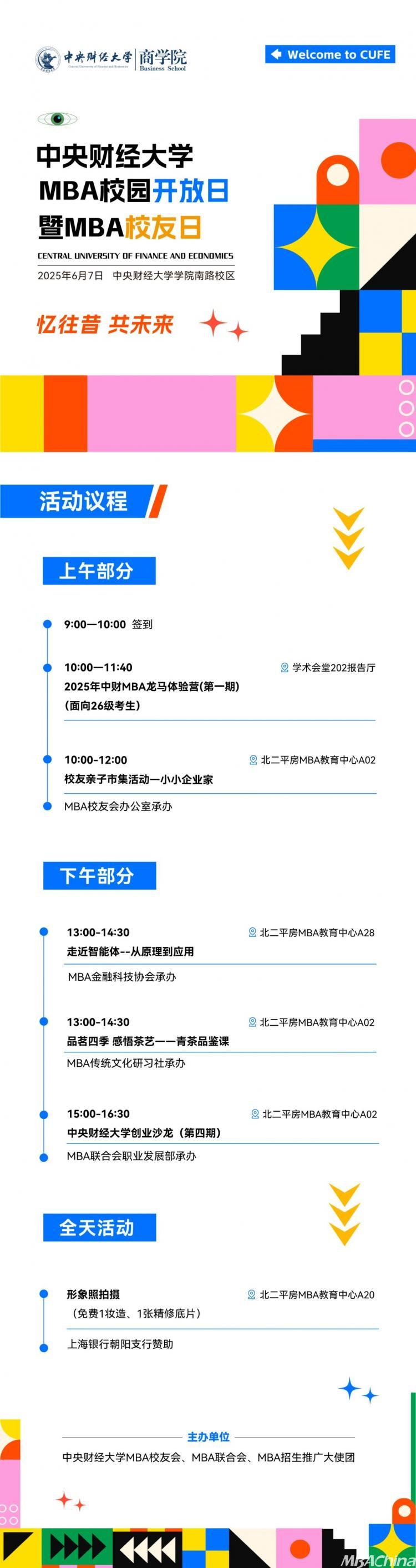 2025中財MBA龍馬體驗營(第一期)相關(guān)活動開啟報名,可關(guān)注龍馬體驗營報名公眾號。其中包括校友親子市集之小小企業(yè)家活動,小朋友可將閑置玩具、書籍等整理出來當(dāng)小老板,體驗定價、談判,鍛煉表達(dá)溝通與財商啟蒙。還設(shè)有形象照拍攝,免費1妝造、1張精修底片,上午對MBA校友、在校生(含25級)開放,下午僅對龍馬營營員開放,龍馬營營員6月7日現(xiàn)場報名,參與規(guī)則以現(xiàn)場通知為準(zhǔn),兩類人員報名均掃碼進群。溫馨提示部分活動地點視報名調(diào)整,入校人員需帶身份證配合刷證入校。